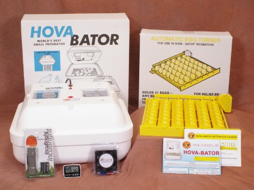 Hova Bator Incubator (Model 1602N) Complete with thermometer, snap action thermostat and easy-to-clean sanitary liner. Made of durable styrofoam to help retain warmth and keep a constant temperature. Incubator features two 5"x 4" viewing windows (great for educational purposes!) and moisture rings built into the liner. Overall dimensions are 18" x 18" x 9-1/4". This is a 110V version, but we do offer a voltage converter for 220/240V. See international page for details. Hova Bator Egg Turner (Model 1611) Comes with Universal size Egg Trays! The turner will automatically turn the eggs 6 times per day and comes complete with universal sized rails (chicken size) that will fit 41 eggs . It's easy to clean and dishwasher safe. This combination of incubator and turner will provide you with a great all around incubator for hatching your eggs. New & Improved Circulated Air Fan Kit Temperature variation within the incubator has a significant impact on your hatch rates. Heat naturally rises, so you need to circulate the hot air from the hot spots to the cool spots for a much more uniform and consistent temperature and better hatch results. The more consistent air temperature also ensures that your thermostat is cycling on and off at the appropriate times, not just when the air around the thermostat heats or cools. This listing comes with a fan kit, complete instructions and all connectors needed to easily install the fan. Digital Thermometer & Hygrometer with MIN/MAX Memory with AAA Battery The Incubator Warehouseâ??s thermometer hygrometer has many features that you wonâ??t find in other models including wider temperature and humidity measurement ranges, more accurate temperature reading, AAA battery included, flip out stand, and backed by the Incubator Warehouseâ??s 1 Year Hassle Free Guarantee * Measures and displays temperature in Celsius or Fahrenheit (Switch on back) * Measures and displays relative humidity * Memory function to recall minimum and maximumRead more HovaBator Deluxe Egg Incubator Combo Kit